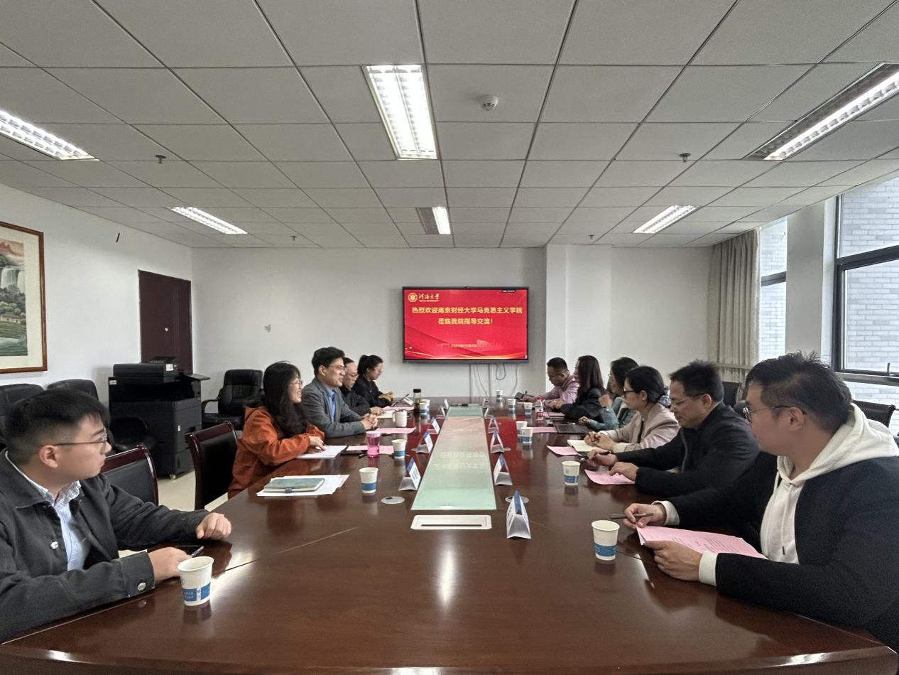 河海大学马院从党建联建、教育服务、科技赋能、实践育人等多方面系统介绍了党建成果。南财马院调研团队也分享了本院“党建+科研+教学”三位一体的创新实践。